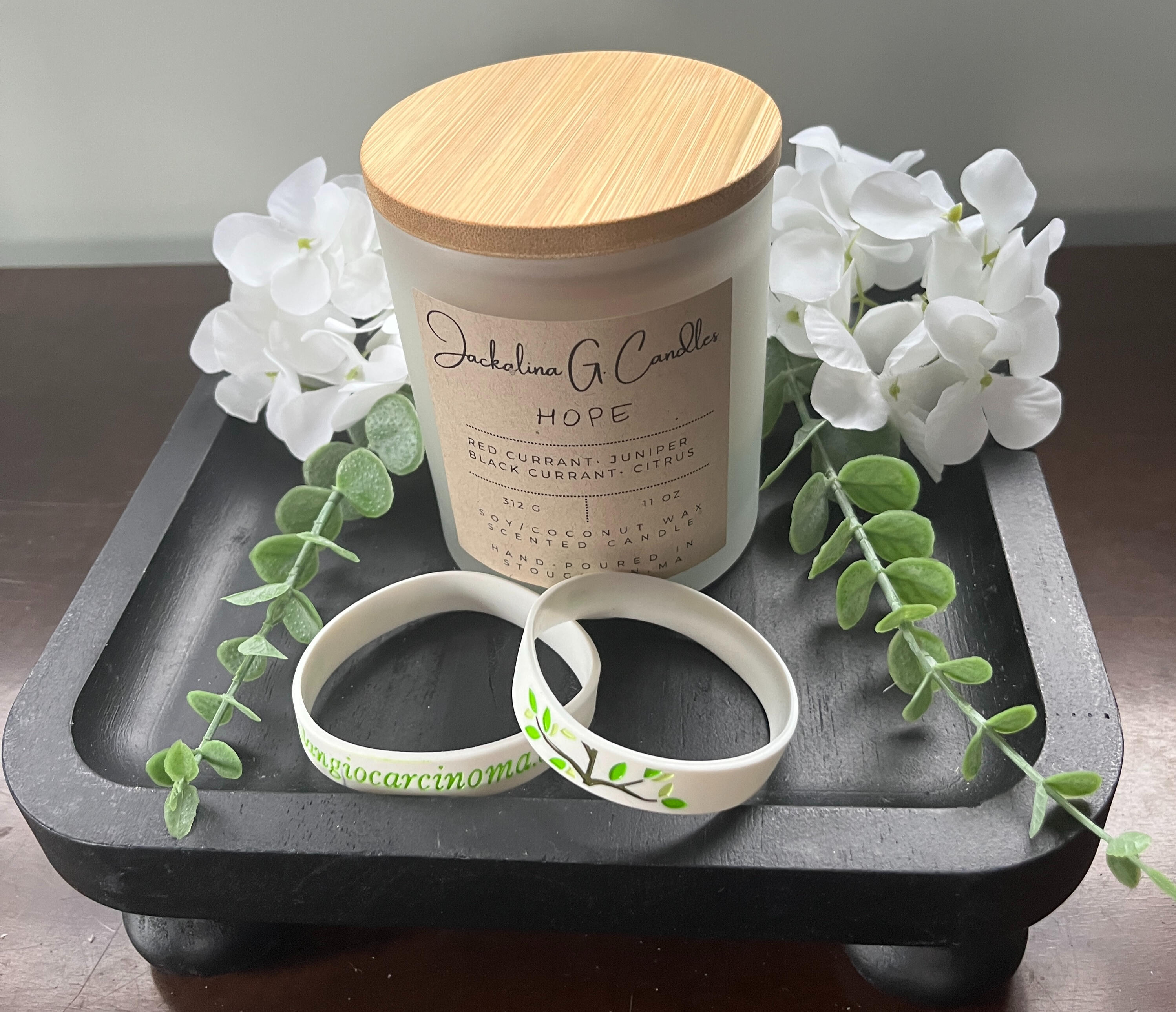 Essential Oils: Lemon + Basil + PatchouliHope Currently in Wick TestingMy Hope candle supports the Cholangiocarcinoma Foundation. My aunt Fran (Fran's Light) passed away of bile duct cancer and clinical research is essential in fighting this horrible disease. 10% of profits of my Hope candle will support the Cholangiocarcinoma Foundation in their research efforts.My Hope candle, formerly known as Berry Kind, gives you a blast of berries and sugar. It gives off Pez candy vibes. My Hope candle burns best in smaller, or medium spaces like a bathroom or kitchen.Note Profile